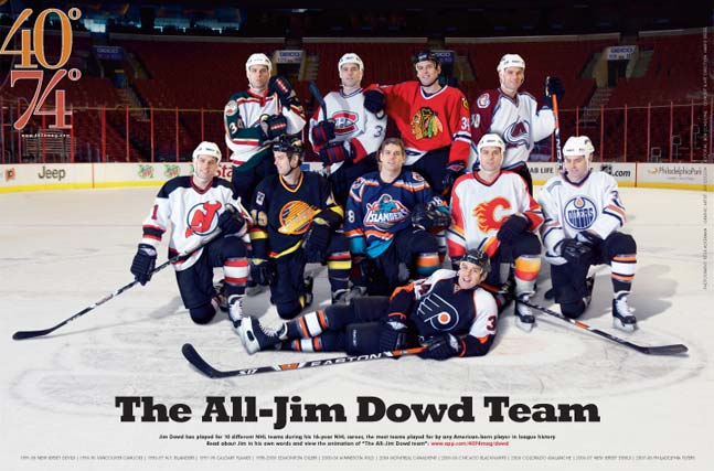 Jim Dowd posed in all 10 of his NHL uniforms. (art: Jeff Colson) |